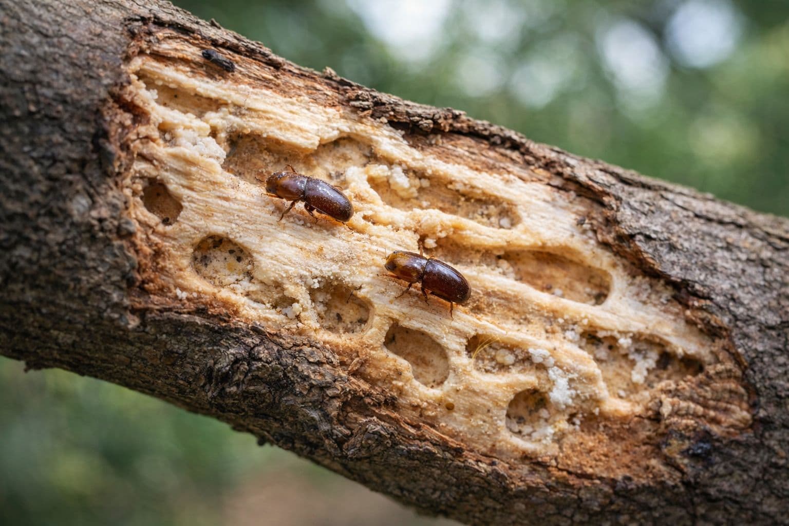 Peeling back bark typically reveals cylindrical galleries colonized by ambrosia fungi that extend into the sapwood and outer xylem. These galleries disrupt normal vascular function, eventually leading to dieback and leaf loss. According to Texas A&M Forest Service extension materials, once foliar symptoms appear, the tree is often too compromised to recover, making early detection critical.