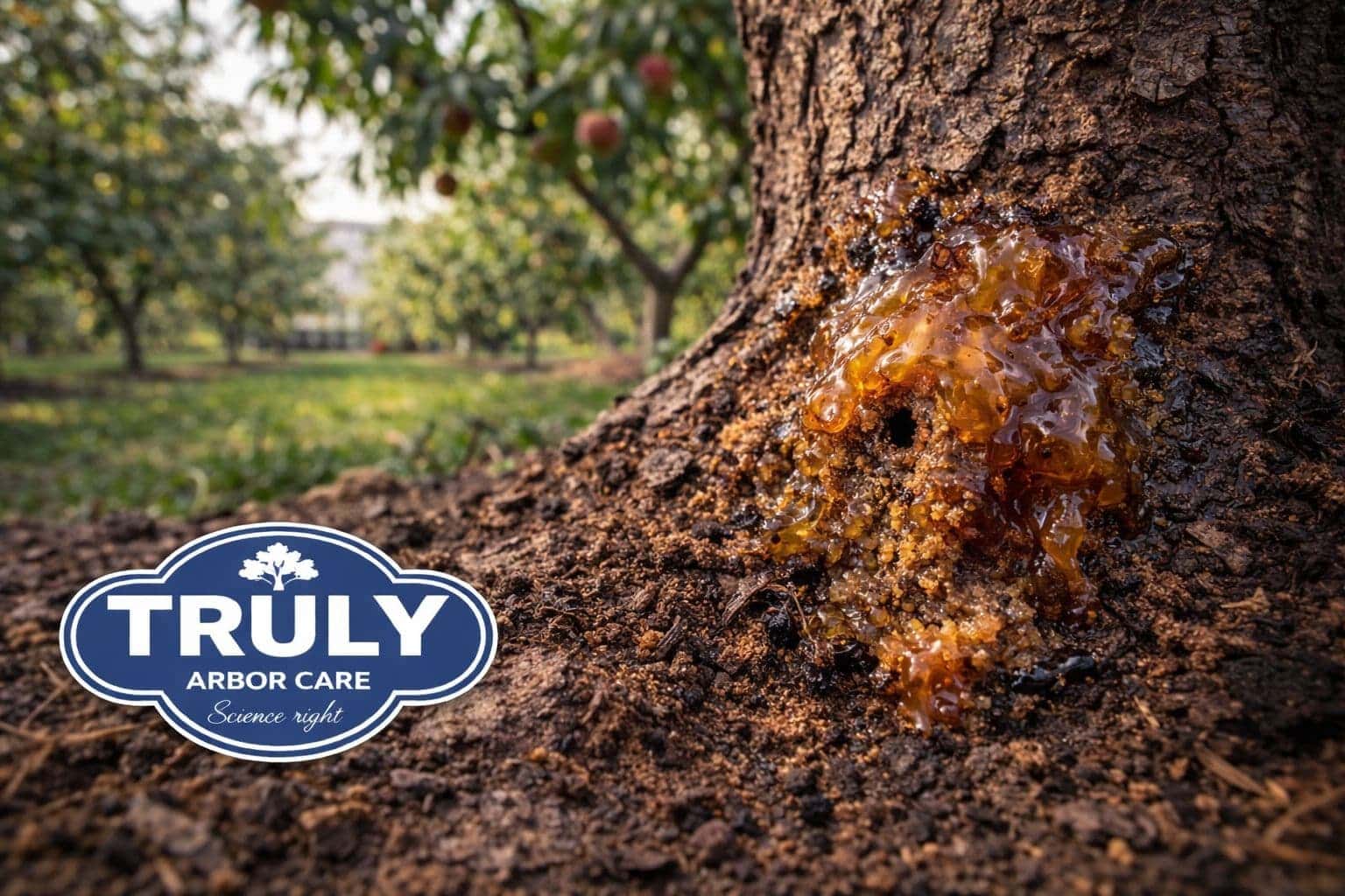 Texas A&M documentation emphasizes that heavy gum exudation at the trunk base is one of the most reliable field indicators.
